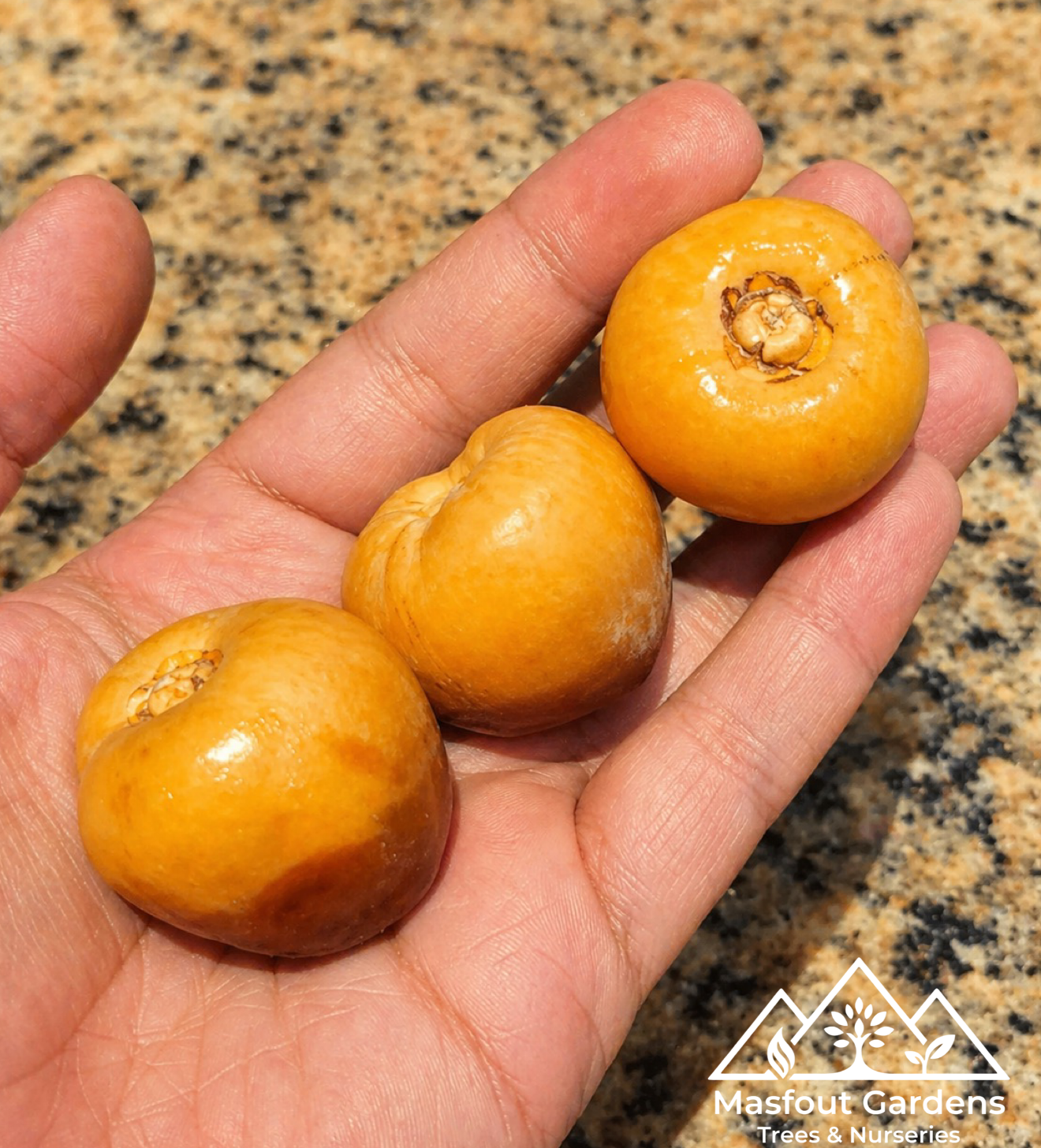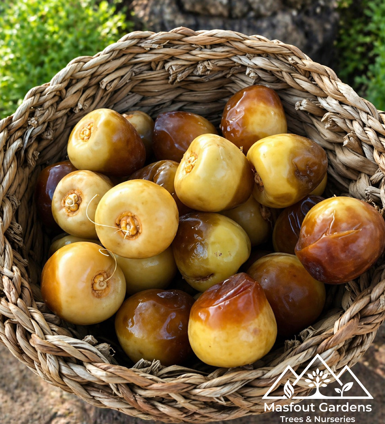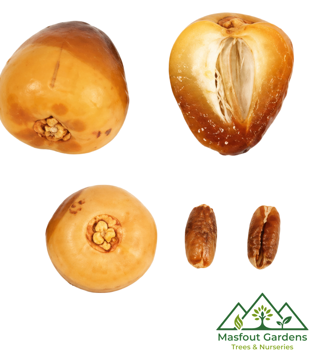 تتميّز بثمارها ذات اللون الأصفر الذي يتحول إلى بني ذهبي عند الترطيب، بقوام طري وطعم غني.