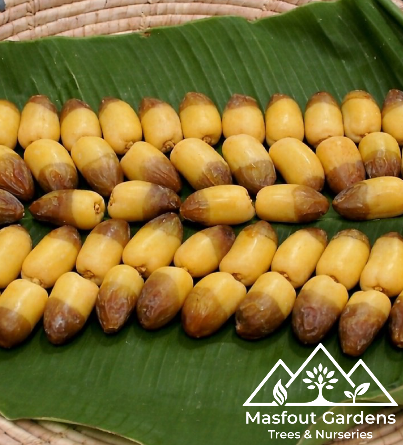 ثمارها متوسطة الحجم، ذات شكل أسطواني مائل، تبدأ باللون الأصفر ثم تتحول إلى رطب طري غني بالطعم.